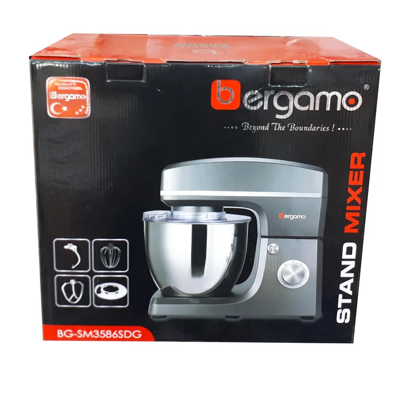 این میکسر ایستاده به یک کاسه استیل ضد زنگ 6 لیتری با درپوش محافظ مجهز گردیده که می تواند نیاز منازل با کارهای سنگین و یا قنادی ها را برای تهیه کیک های خوشمزه، نان، پیتزا، پاستا، دسر، بیسکویت و ... برآورده سازد. همزن حرفه ای Bergamo BG-3586SDG، دارای 2 عملکرد دیگر همچون خمیرزن و ورزدهنده می باشد. همچنین قسمت پایین میکسر، پایه های بدون لغزشی طراحی شده تا بدین وسیله ثبات دستگاه حفظ شود.
