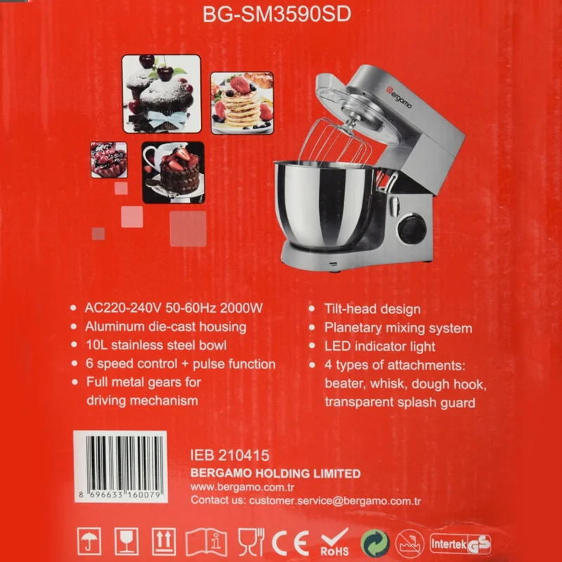این محصول مناسب کسانی است که دارای مهارت های بالا برای تهیه انواع و اقسام خوراکی ها می باشند. همچنین وسیله ای مناسب برای آنهایی هست که قصد ارتقا و بهبود توانایی های خود در زمینه آشپزی را دارند.این محصول دارای سه عدد سری های کاربردی تمام فلزی با یک کاسه استیل ضد زنگ می باشد. ظرفیت کاسه همزن کاسه دار برگامو BG-SM3590SD ده لیتر می باشد. داشتن طراحی ویژه این نوع همزن را برای پخت و شیرینی بسیار مناسب کرده است. همچنین مجهز به تنظیم سرعت است این همزن کاسه دار دارای توان قدرت 2000 وات واقعی است.