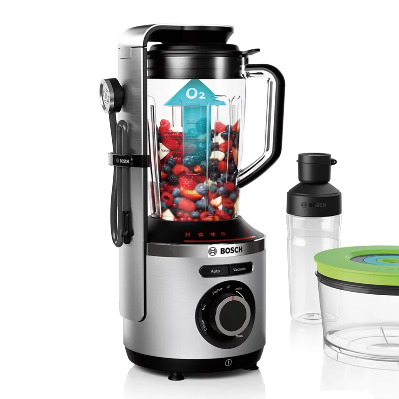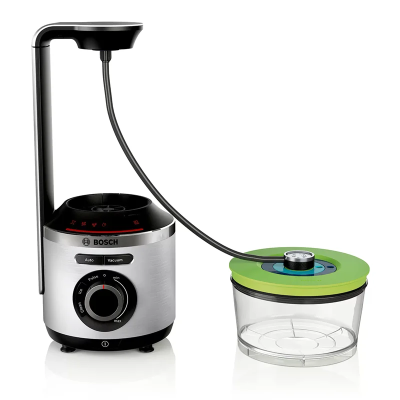 چهار برنامه خودکار تنها با لمس یک دکمه! بلندر Bosch MMBV625M به 4 عملکرد وکیوم، اتوماتیک، خردکننده یخ و تمیزسازی خودکار مجهز شده که موجب افزایش راندمایی و کارایی آن گردیده است. علاوه بر این، قابلیت پالس و تنظیم سرعت متغیر نیز در این مدل وجود دارد. هر غذایی را برای طراوت بیشتر در ظروف خلا ذخیره کنید! غذا باید به مدت طولانی تازه بماند تا از اتلاف مواد غذایی جلوگیری شود. به همراه این محصول دو ظرف قابل شستشو با گنجایش (1.5 لیتر و 0.75 لیتر) از جنس تریتان ارائه شده که به لطف آنها می توان با تنظیم تاریخ، غذاهای باقیمانده یا سبزیجات را در آنها نگهداری کرد تا مواد غذایی 2 برابر تازه تر و با طراوت بیشتری بمانند.