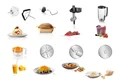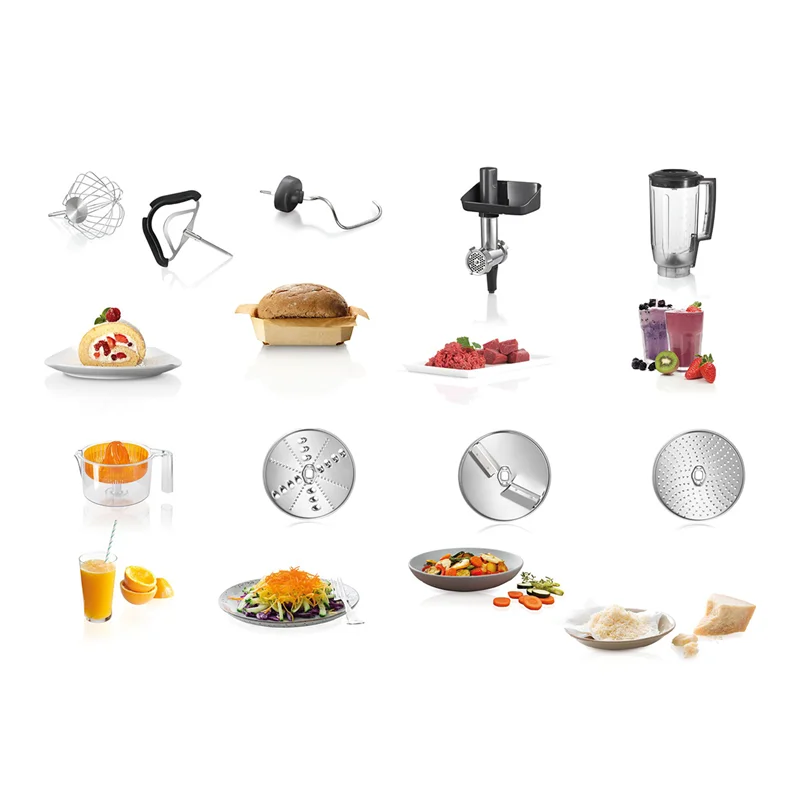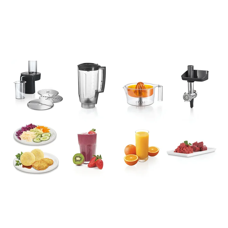 همچنین دستگاه دارای قطعه های چرخ گوشت، آب مرکبات گیری و مخلوط کن نیز میباشد.یک ولوم چرخشی با قابلیت تنظیم در 7 درجه، بر روی بدنه دستگاه تعبیه شده است. سیستم ایمنی موتور این دستگاه، در صورت گرم شدن بیش از حد باعث خاموش شدن آن به صورت خودکار میشود. پایه های دستگاه از چابجایی و لغزش حین کار جلوگیری میکند. برای نگهداری قطعات جانبی یک کیف همراه دستگاه قرار دارد.