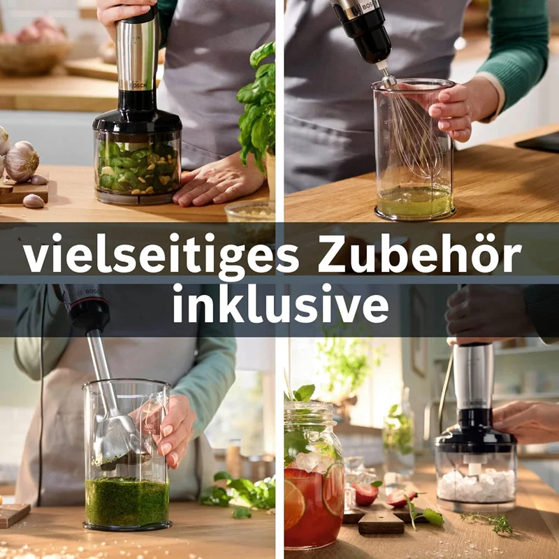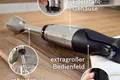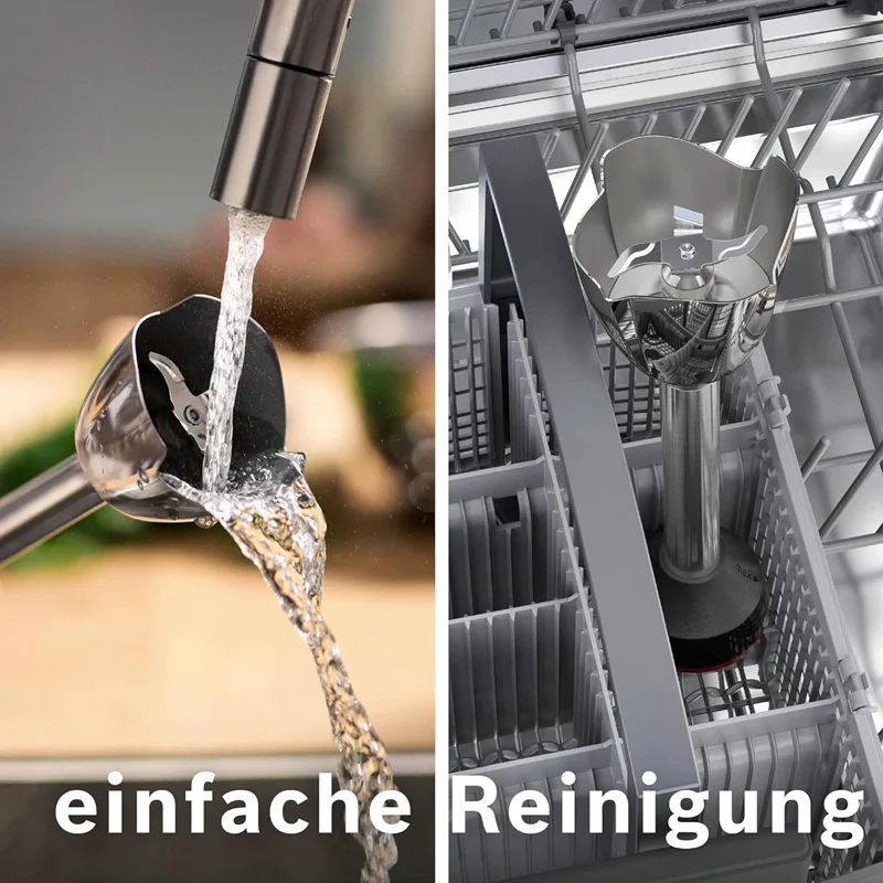 طراحی خاص پایه مانع از پاشیده شدن مواد غذایی به اطراف میگردد. تیغه های استیل ضد زنگ و 4 لبه این دستگاه موجب سرعت بخشیدن به کار میشود. پایه دستگاه به راحتی و با پیچاندن باز میگردد و میتوان درون ظرفشویی قرار داد. توسط کلید روی پنل میتوان دستگاه را خاموش و روشن نمود. یک لیوان پلاستیکی در اندازه 600 میلی لیتر برای آماده سازی مواد غذایی درون آن ، همراه با دستگاه ارائه شده است.تمیز کردن آسان لوازم جانبی فقط چند ثانیه طول می کشد. پس از مخلوط کردن، پای همزن را با یک کلیک ساده رها کنید تا زیر آب جاری یا در ماشین ظرفشویی تمیز شود.