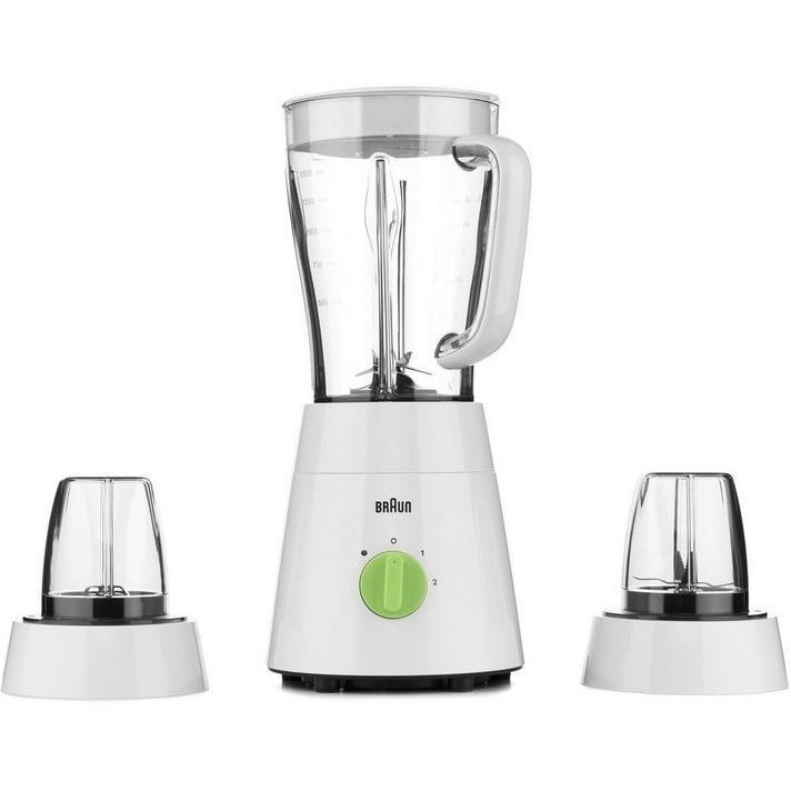 مخلوط کن سه کاره براون مدل JB0153 با توان مصرفی ۵۰۰وات و ولتاژ ۲۲۰ولت قدرت بسیار بالایی و مناسبی برای خرد کردن و آسیاب کردن انواع مواد غذایی دارد.مخلوط کن سه کاره براون مدل JB0153 دارای یک پارچ با ظرفیت ۱.۷۵لیتر و دو آسیاب با ظرفیت ۰.۵لیتر است.جنس بدنه مخلوط کن از پلاستیک بسیار مقاوم و جنس پارچ و آسیاب ها از کروماگان شفاف که نوعی پلاستیک بسیار سخت و ضد خش و ضد ضربه میباشد است.ابعاد مخلوط کن به قطر ۱۷سانت و ارتفاع ۳۹سانت میباشد و وزن خالص دستگاه ۱.۸کیلوگرم است.