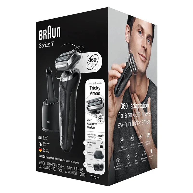 این ماشین اصلاح قابلیت شارژ سریع 5 دقیقه ای را دراراست که برای یک اصلاح کامل کفایت می کند. این محصول مجهز به سیستم EasyClick بوده و می توانید ریش تراش خود را برای نیازهای بیشتر نظافت به روز کنید.ریش تراش براون مدل 7075cc کیفیت بسیار عالی و بینظیر دارد.در این محصول سه تیغ با جنس استیل ضد زنگ استفاده شده است. در دو طرف کلگی دستگاه دو عدد شیور طراحی شده است.  در وسط دو عدد تیغه برای بلند کردن و کوتاه کردن موهای خوابیده روی صورت قرار داده شده است.
