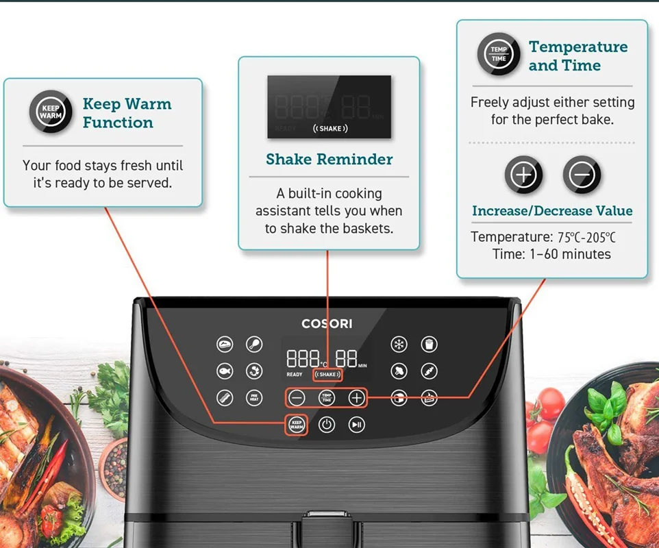 سرخ کن کوسوری مدل 137 دارای (13 حالت پخت و پز) شما به راحتی می توانید از 13 حالت مختلف منو از جمله استیک، مرغ، غذاهای دریایی (ماهی و میگو)، بیکن، غذای منجمد، سیب زمینی سرخ شده، سبزیجات، نان، دسر و غیره استفاده کنید.سبد جداگانه: در مقایسه با سرخ کن های معمولی، سرخ کن بدون روغن COSORI دارای یک سبد جداکننده منحصر به فرد است که آن را لذت بخش تر و راحت تر می کند.