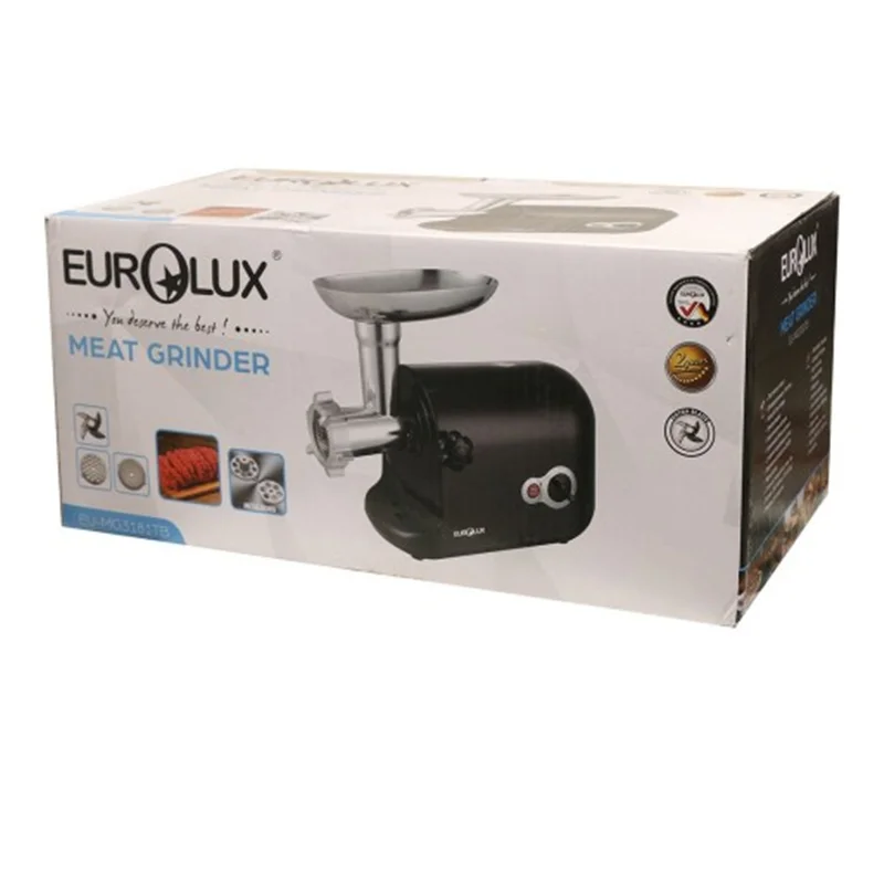 این چرخ گوشت از محصولات برند یورولوکس است، بنابراین واضح است که این چرخ گوشت از کیفیت عالی برخوردار است. برند یورولوکس ( EUROLUX ) با تولید و عرضه محصولات در سطح جهانی توانسته است رضایت مردم سراسر جهان را به خود جلب کند. چرخ گوشت یورولوکس مدل EU-MG3181TB نیز همانند سایر محصولات این برند دارای طرفداران بسیاری است.چرخ گوشت یورولوکس مدل EU-MG3181TB دارای ظاهری زیبا و خاص است. این دستگاه دارای بدنه ای سیاه رنگ است که مورد پسند علاقمندان به رنگ سیاه قرار گرفته است. این دستگاه در ابعاد 500x300x220 میلیمتر و با وزن 4.5 کیلوگرم تولید و عرضه می شود.