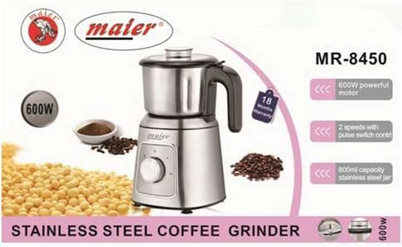 آسیاب برقی حرفه ای مایر مدل MR-8450 با توان قدرت 600 وات نه تنها برای آسیاب قهوه مناسب است ،هر نوع دانه ای را خرد میکند.این آسیاب با یک موتور قدرتمند 600 وات کار می کند ، که نتیجه ان مواد ریز شدەی کامل را برای شما تضمین می کند. تیغه های فولاد ضد زنگ این دستگاه را برای آسیاب کردن مغزها ، قهوه ، گندم ، برنج غلات ، ادویه ها و سایر غذاهای خشک همه کاره عمل می کند.ظرف آسیاب حداکثر ظرفیت 800 گرم دارد.