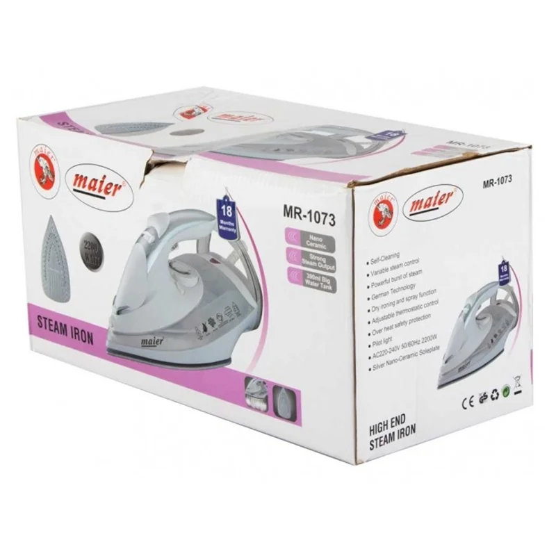 اتو بخار مایر مدل MR-1073 از جدیدترین محصولات ساخته شده کمپانی مایر می باشد این اتو بخار دارای رنگ سفید و جنسی عالی و با کیفیت می باشد و انتخاب مناسبی برای سخت پسندان و زیبا پسندان می باشد . توان 2200 وات مناسب اتوکشی لباس های بلند مانند لباس عروس، پیراهن های بلند، لباس های آویزان، کت و شلوار و پرده می باشد.