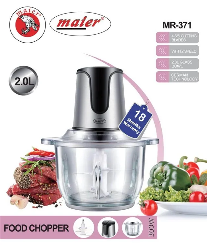 این خردکن برقی حرفه ای و پرقدرت در کمپانی مایر تولید شده است. کارخانهی مایر , کمپانی خوش نام و باسابقه می باشد که در حوزههای مختلفی کار می کند. یکی از این حوزه ها وسایل برقی خانگی است که موفق شده است با عرضه کالاهایی با کیفیت و به کار بردن فناوری های مدرن در این حوزه، بخش بزرگی از بازار را در برگیرد و در سطح بین المللی زبان زد شود. قابلیت منحصربه فرد این محصول بهرمندی از شفت فلزی و مغزی فلزی میباشد که نسبت به دیگر خردکن ها که این قسمت پلاستیکی میباشد, مزییت ویژه ای محسوب میشود. این خردکن برقی تیغه های تیزی دارد که هر نوع گوشت , مرغ و سبزیجاتی را می تواند خرد کند و دارای 4 پره میباشد که این قابلیت را دارد تا مواد را در نهایت به تکه ها یکسان ریز کند؛ موتور 300 وات خردکن در بالای دستگاه وجود دارد و نحوهی کار با آن بسیار سریع و راحت با فشار دکمه بالای خردکن به طرف پایین عمل خرد کردن انجام می شود و درآخر، فرد نتیجه خوبی خواهد گرفت. این طرز استفادهی آسان و فاقد پیچیدگی، آن را به محصولی مناسب برای کلیه کاربران تبدیل نموده است و همچنین دارای دو سرعت کند و تند میباشد که مناسب با موادی که داخل خردکن هست قابل تغییر هست.