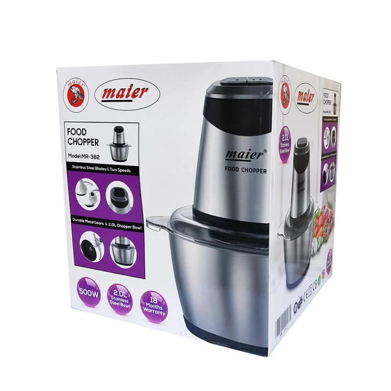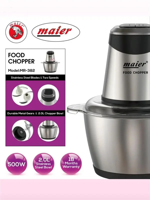 خردکن برقی مایر مدل MR-382 دارای توان 500 وات است که قدرت بسیار مناسبی برای خرد کردن دارد.ظرفیت کاسه 2 لیتر می باشد.دارای تیغه 4 پره تمام استیل ضد زنگ و تیز که قدرت خاصی بدستگاه می دهد.