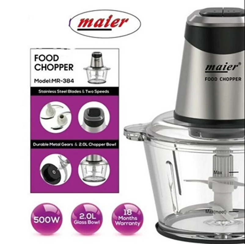 خردکن مایر مدل MR-384 از محصولات کاربردی این کمپانی میباشد که امروزه بسیار پر طرفدار است. این محصول برای افرادی که وقت کافی برای آشپزی ندارند و میخواهند از غذای سالم و لذت ببرند بسیار مناسب است چرا که به کمک این دستگاه در زمانی کوتاه میتوانند غذای موردنظر را آماده کنند. این خرد کن دارای توان ۵۰۰ وات بوده که نشان از قدرت بالای موتور است. ظرفیت مخزن در این خرد کن ۲ لیتر بوده که برای مهمانی های جمعیت بالا نیز کاربرد دارد. جنس بدنه این دستگاه از استیل ضد زنگ بوده و دارای مقاومت بالایی است. همچنین شاهد یک مخزن بزرگ از جنس شیشهی محکم هستیم که میتوانیم موادغذایی را در هنگام خرد شدن مشاهده نماییم. این خرد کن مجهز به تنظیمات سرعت در ۲ حالت مختلف نیز هست. این دستگاه برای خرد کردن انواع موادغذایی مانند؛ گوشت قرمز، مرغ و ماهی، سبزیجات مختلف، پیاز و سیب زمینی، دانه های قهوه، چوب دارچین و سایر ادویه ها، تهیه پوره های مختلف، تهیهی مایه کتلت و کوکو ، انواع معجون و اسموتی و ... بسیار کاربردی عمل میکند.
