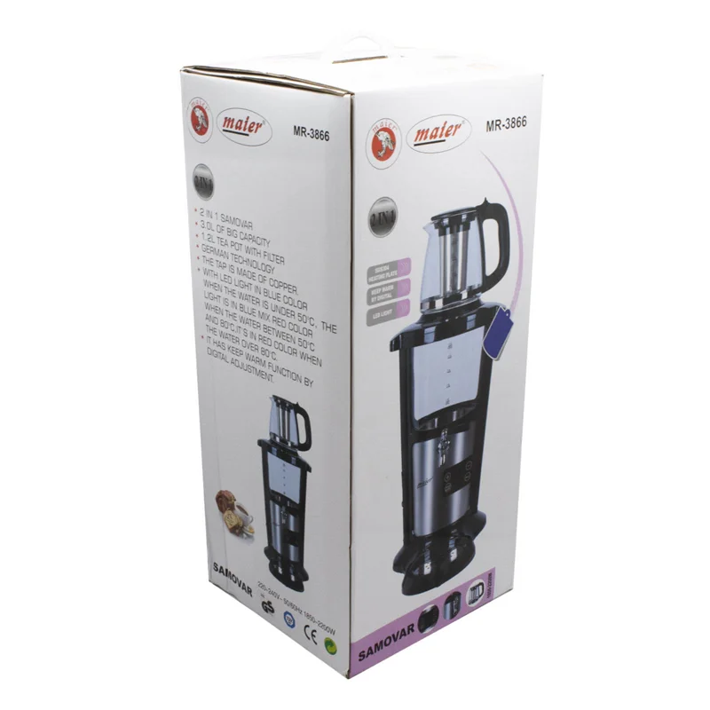سماور برقی مایر مدل MR-3866 در رنگ مشکی توسط شرکت مایر (یکی از تولیدکنندگان بنام و مشهور المانی) تولید شده است. این سماور برقی دارای قدرت 2200 واتی است که در مقایسه با محصولات مشابه دارای قدرت بالا و مناسبی می باشد.ظرفیت این سماور 3 لیتر و ظرفیت قوری آن 1.2 لیتر است که حجم کتری آن توسط نشانگر هایی که بر روی بدنه ثبت شده اند با چشم قابل اندازه گیری می باشد. بدنه این سماور از استیل ضد زنگ، پلاستیک و پیرکس ساخته شده است، همچنین صافی قوری آن نیز از جنس استیل ضدزنگ می باشد. برای سماور برقی مایر مدل MR-3866 کلید روشن/خاموش و همچنین 2 دکمه برای گرم نگه داشتن و یا جوش آوردن آب و 2 دکمه نیز برای تعیین دمای آب قرار داده شده که می تواند به راحتی مورد استفاده قرار گیرد. یکی از ویژگی هایی که این محصول را با دیگر محصولات متمایز و برتر می کند، شیر سماوری آن است؛ که جدا از زیبایی باعث میشود هنگام استفاده بر روی ظرف یا لیوان کف ایجاد نشود. از دیگر نکات ویژه این سماور برقی LED هایی است که در داخل آن تعبیه شده، که هنگام استفاده زیبایی خاصی به دستگاه می بخشد. به طوری که اگر این چراغ LED آبی باشد یعنی دمای آب زیر 50 درجه سانتی گراد است، اگر مخلوط آبی و قرمز باشد یعنی دمای آب بین 50 تا 80 درجه سانتی گراد و اگر کاملا قرمز باشد یعنی دمای آب بالای 80 درجه سانتی گراد است.