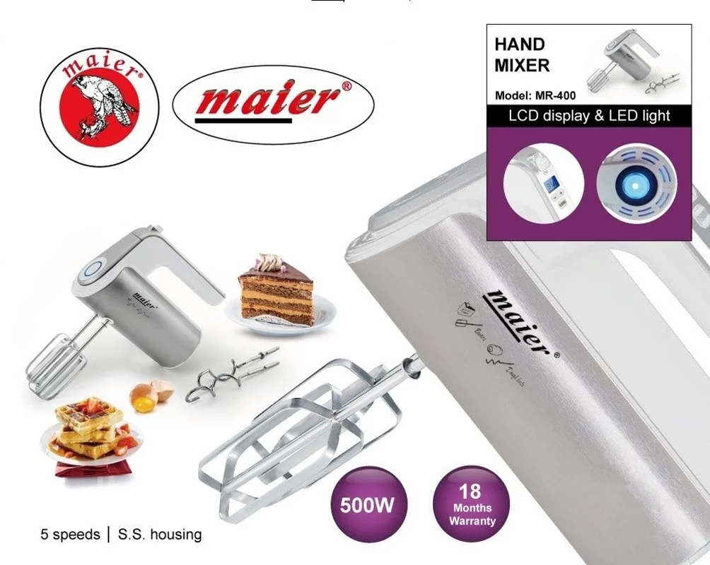 همزن دستی مایرMR-400 توان 500 وات است. قدرت بالای این محصول میتواند به پخت و پز آسان و سریع در کنار فعالیتهای روزانه کمک شایان ذکری باشد. همچنین دارای ۵ سرعت مختلف برای موقعیت های متفاوت است. همچنین دارای عملکرد توربو برای همزدن سریع نیز می باشد.جنس میله های همزن از جنس استیل ضد زنگ است. و ماندگاری بالایی دارد. و همچنین دکمه جهت سهولت تعویض میله ها و صفحه نمایش ال ای دی می باشد.