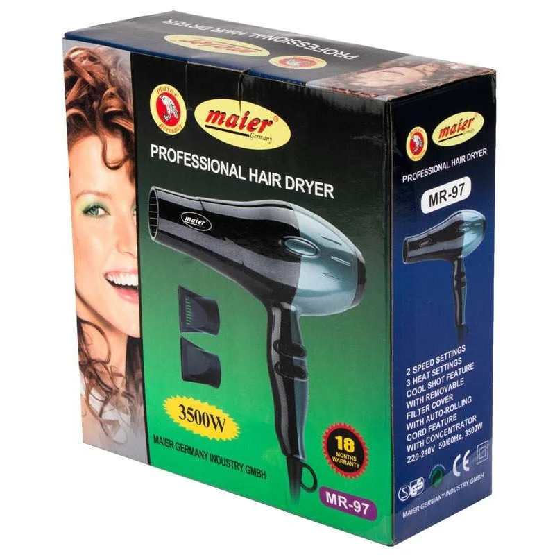 سشوار مایر مدل MR _ 97 دارای موتور AC با توان 3500 وات میباشد. المنت به کار رفته در این سشوار از جنس پیشرفته بوده و باعث می شود تا موها ظاهر ابریشمی و لطیف پس از خشک کردن داشته باشند. موتور سشوار مایر AC بوده و در کنار قدرت فوق العاده ای که دارد صدای زیادی را نیز تولید نمی کند و به وسیله آن می توانید موهای خود را خیلی سریع خشک و یا حالت دهی کنید. شما می توانید سرعت باد سشوار را در دو حالت و حرارت آن را هم در 3 حالت متفاوت تنظیم کنید.