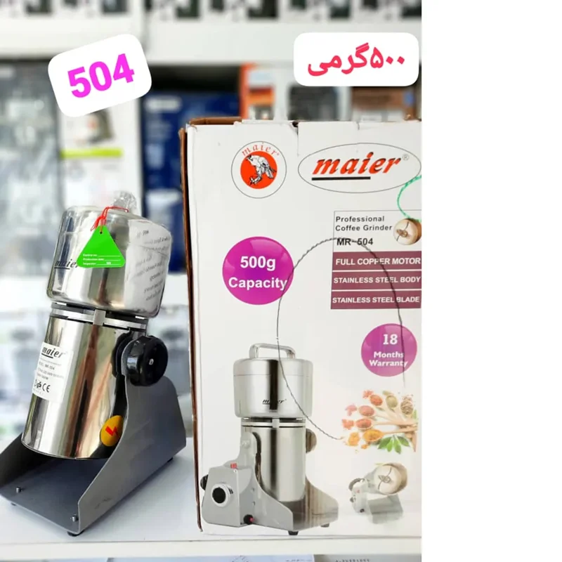 آسیاب مایر مدل MR-504 توان مصرفی 2200 وات دارد، که با ظرفیت 500 گرم، کاملا مناسب برای آسیاب دانه های قهوه و موارد مشابه مثل برنج، دانههای سویا، ذرت و آن هم در حدود یک دقیقه است. همچنین آسیاب انواع ادویه جات مثل فلفل،پاپریکا، زنجبیل خشک، فلفل سفید و سیاه، رازیانه، بادیان ستاره ای، کاسیا و غیره در حدود 40_ 30 ثانیه! این محصول کاملا کاربردی با مناسب ترین قیمت در سایت پاگلی موجود می باشد.