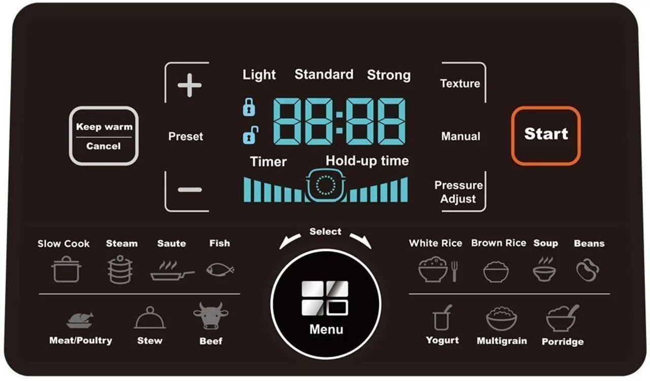 .شما می توانید مقدار فشار را با توجه به درجه سختی غذا تنظیم کنید تا باعث بهبود بهتر پخت غذا شود. بر روی بدنه دستگاه نمایشگر بزرگ LED با طراحی مدرن قرار گرفته است که میتوانید برنامه مورد نظر خود را انتخاب نمایید.این محصول از فناوری قفل درپوش بهره می برد به طوری که نمی توانید درب آن را بردارید مگر اینکه فشار داخل آن در سطح مطمئنی باشد. از دیگر ویژگی های زودپز میدیا میتوان به قابلیت تهیه ته دیگ، تایمر 24 ساعته، قابلیت جداسازی محفظه داخلی و درب اشاره کرد. این زودپز همراه با یک قاشق برنج ، ملاقه ، فنجان اندازه گیری و قفسه بخار برای راحت تر و همه کاره بودن پخت و پز است.