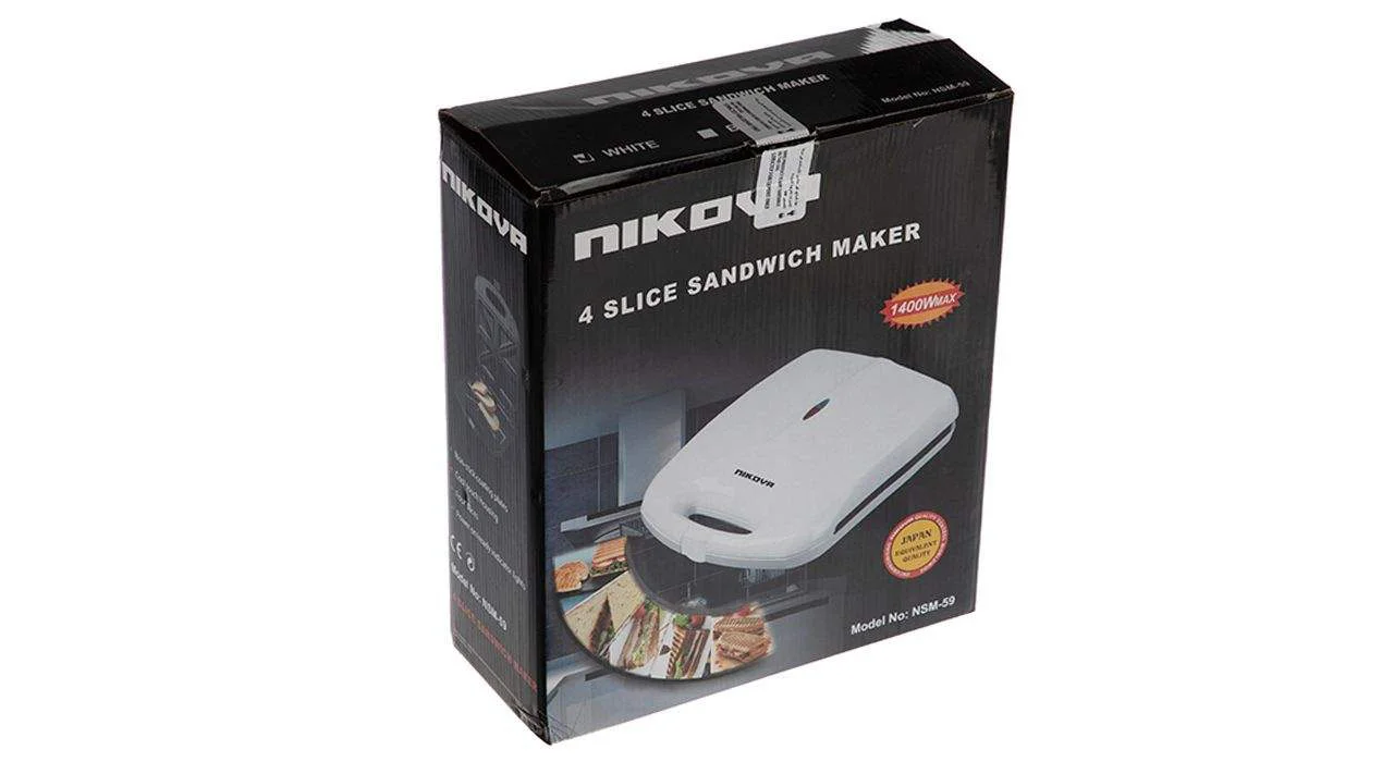 ساندویچ نیکووا مدل NSM-59 یکی از محصولات باکیفیت این شرکت است. توان مصرفی این دستگاه 1400 وات است و دارای صفحۀ مخصوص ساندویچ ساز بوده که امکان طبخ همزمان 8 عدد ساندویچ مثلثی شکل (4 عدد ساندویچ مربعی) را دارد هر دو صفحه این دستگاه شامل المنت حرارتی هستند که باعث پخت سریع، همزمان و یکپارچه ساندویچ ها میشود.