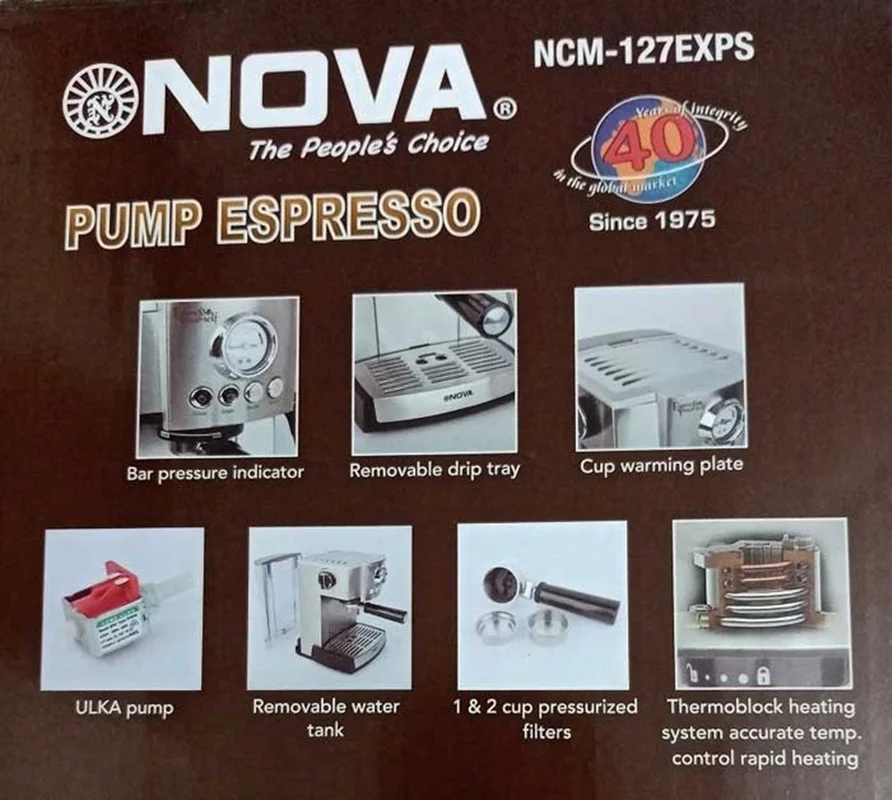 اسپرسوساز نوا مدل NOVA NCM-127EXPS یکی از دستگاه های فوق العاده با کیفیت کمپانی نوا میباشد که درآن نهایت طراحی حرفه ای و استقامت بدنه به کار گرفته شده است و برای کافه بسیار مناسب است و با فشار بخار 15 بار و قدرت توان مصرفی 1250 وات مجهز به نازل تولید بخار است که از آن برای تهیه کاپوچینو و کف شیر و انواع نوشیدنی های گرم استفاده می شود. اسپرسوساز نیمه صنعتی نوا NOVA NCM-127EXPS با قدرت بخار ۱۵ بار و توان مصرفی 1250 وات با نشانگر درجه فشار بخار عقربه ای یک اسپرسو ساز نیمه صنعتی و بسیار قوی محسوب می شود.اسپرسوساز نیمه صنعتی نوا NOVA NCM-127EXPS با ۳ کارایی ویژه برای شما عزیزان عرضه شده است.