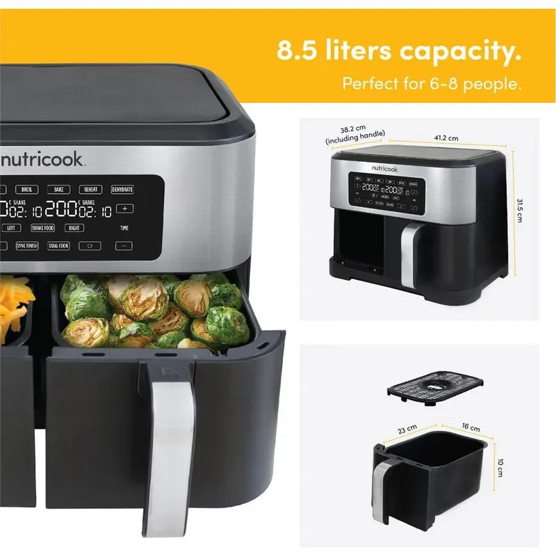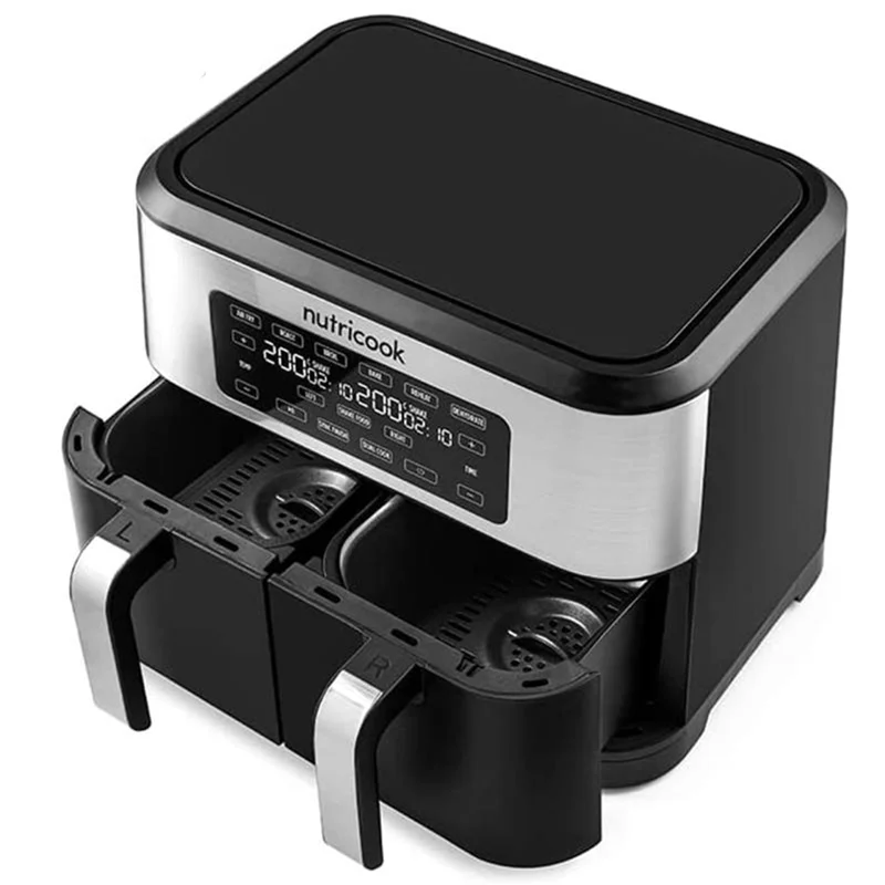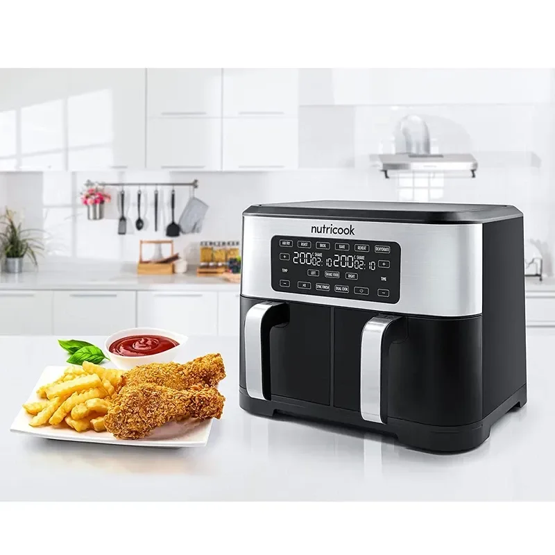 سرخ کن ( هواپز) دو سبد. Nutricook Air Fryer Duo دارای دو سبد بسیار بزرگ با کنترل مستقل است تا بتوانید غذاهای مختلف را به روش های مختلف به طور همزمان بپزید. یادآوری تکان دادن. Air Fryer Duo همراه با یادآور تکان دادن که به شما این امکان را میدهد بدانید چه زمانی باید محتویات را تکان دهید تا یکنواخت سرخ شوند.