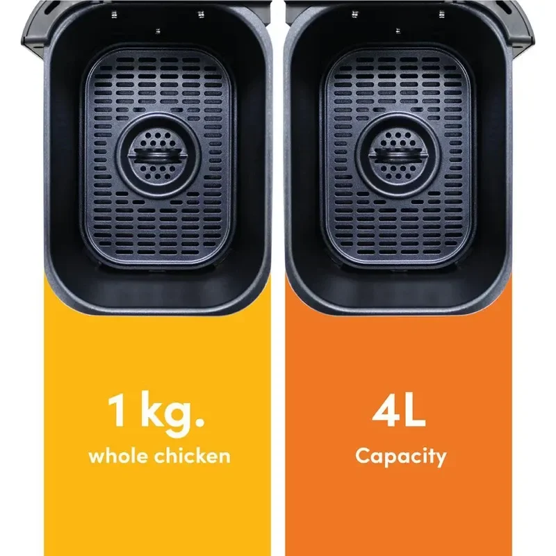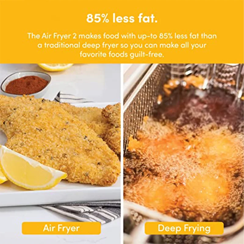 آشپزی در یک لمس. فقط کافی است هر یک از برنامه های پیش فرض لمسی را بزنید – سرخکردن ، کباب کردن، کباب برشته، پخت، گرم کردن مجدد و خشک کن (میوه و سبزیجات) سیستم DualCook. با ویژگی DualCook ما که به راحتی تنظیمات را در هر دو سبد تکرار می کند، وعده های غذای سرخ شده مورد علاقه خود را دو برابر کنید و در زمان صرفه جویی کنید. همگام سازی پایان. ویژگی Sync Finish ما پخت و پز را در هر دو سبد همگام می کند تا اطمینان حاصل شود که غذاها همزمان آماده هستند.