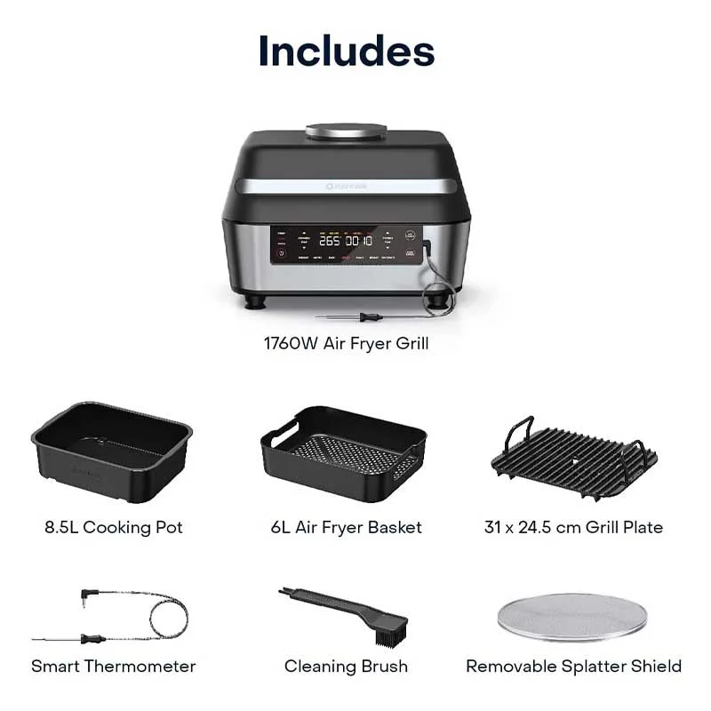 گریل و سرخ کن هوشمند داخلی نوتریکوک مدل NUTRICOOK AFG960 با دماسنج داخلی، گریل، سرخ کردن هوا، کباب کردن، پخت، آبگیری و گرم کردن مجدد می باشد.این محصول شامل گریل سرخ کن هوای هوشمند 1760 واتی XL، دیگ پخت 8.5 لیتری، سبد سرخ کن 6 لیتری، صفحه گریل 31 در 24.5 سانتی متر، دماسنج هوشمند، محافظ پاشش قابل جابجایی، برس تمیزکننده است.