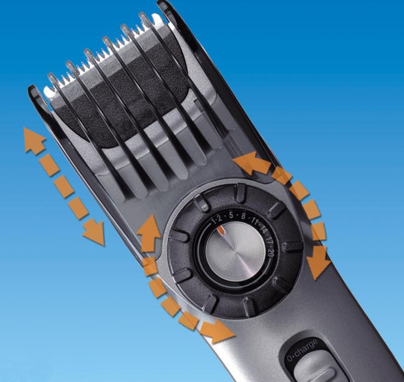 یکی از ویژگیهای مهم ER217، قابلیت تنظیم طول اصلاح از 0.5 تا 20 میلیمتر است. این محدودهی تنظیم باعث میشود بتوانید مدلهای مختلفی از تهریش تا کوتاهی کامل مو را بهراحتی انجام دهید. در قسمت جلویی دستگاه یک ولوم چرخشی تنظیم طول تعبیه شده که بهصورت مرحلهای طول برش را تغییر میدهد. این ویژگی باعث میشود نیازی به استفاده از شانههای متعدد نباشد و تنظیم طول تنها با چرخاندن یک دکمه انجام شود.