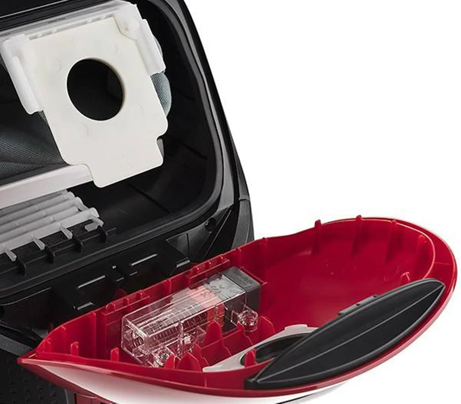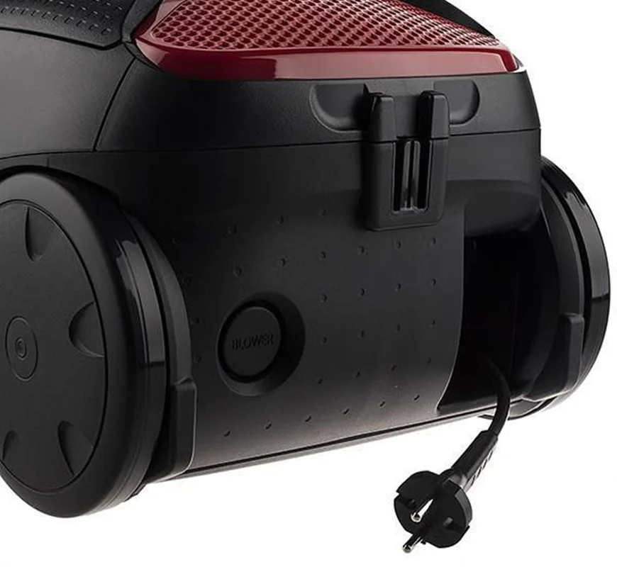 هرازگاهی که کیسه پر شد و نشانگر هم این امر را مشخص کرد، باید کیسهی مخزن زباله بیرون آورده شده و تخلیه شود. در این مدل میتوان از کیسههای یکبارمصرف هم استفاده کرد؛ ولی کیسهی اصلی از مزیت قابلشستوشوبودن برخوردار است. مخزن ذخیرهسازی تا 6 لیتر ظرفیت دارد. لولهی خرطومی و لولهی فلزی این مدل، استفاده از آن را راحت میکند. سیم برق با طول زیاد، باعث شده شعاع فعالیت این جارو افزایش یابد. سیمجمعکن از روی بدنه فعال میشود و کابل برق را به داخل دستگاه جمع میکند. در کنار همین قسمت، محلی برای خروجی باد در نظر گرفته شده و به این صورت جارو حالت دمنده پیدا میکند.