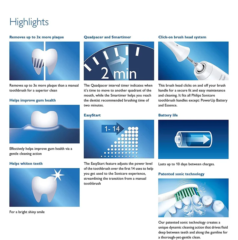 همچنین قادر است بهطور سهبعدی دندانها را سفید و براق کند. سری مسواک دارای الیاف نرم و لطیفی است که حتی برای تمیزکردن لثهها هم کاربرد دارد و میتواند برای انواع دندانها حتی دندانهای حساس استفاده شود. تکنولوژی دوبعدی مسواک فیلیپس هم نوسانی و هم دورانی بوده و قادر است تمام سطوح دندانها را بشوید. مسواک برقی فیلیپس با چرخش زاویهای، دندانها را تمیز میکند و دیگر نیازی نیست دست حرکت زیادی داشته باشد.