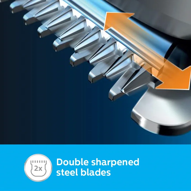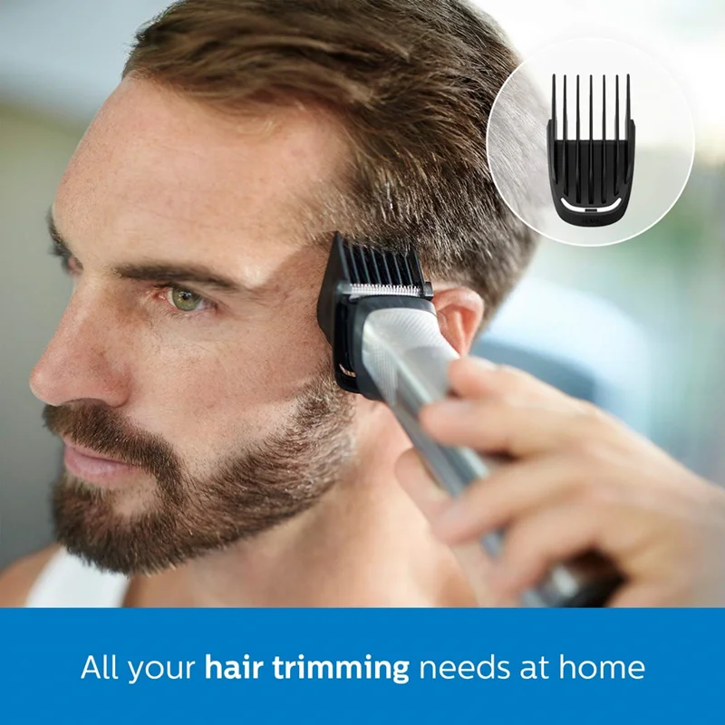 پس از استفاده از این سری میتوان به کمک تریمر باریکتر، ریش و سبیل را مرتب کرد. بهعلاوه سری بزرگتری برای اصلاح موهای بدن در نظر گرفته شده است. موزن بینی و گوش هم این مجموعه را تکمیل کرده تا دیگر نیازی به تهیهی یک دستگاه مجزا نداشته باشید. این موزن با برش چرخشی امکان اصلاح سریع و بیخطر موهای زائد را فراهم کرده است.از هشت شانهای که به همراه این ست اصلاح ارائه شده، دو شانهی تهریش (2،1 میلیمتر)، یک شانهی قابل تنظیم ریش (7،3 میلیمتر)، سه شانهی مو (9،12،16 میلیمتر) و دو شانه برای بدن (3،5 میلیمتر) هستند. فیلیپس قابلیت شارژ سریع را برای این ماشین اصلاح در نظر گرفته و در مواقع عجله میتوانید با پنج دقیقه شارژ، دستگاه را دوباره راهاندازی کنید. شارژ کامل یک ساعت طول میکشد و در حالت فولشارژ، دستگاه میتواند تا 120 دقیقه کار کند.