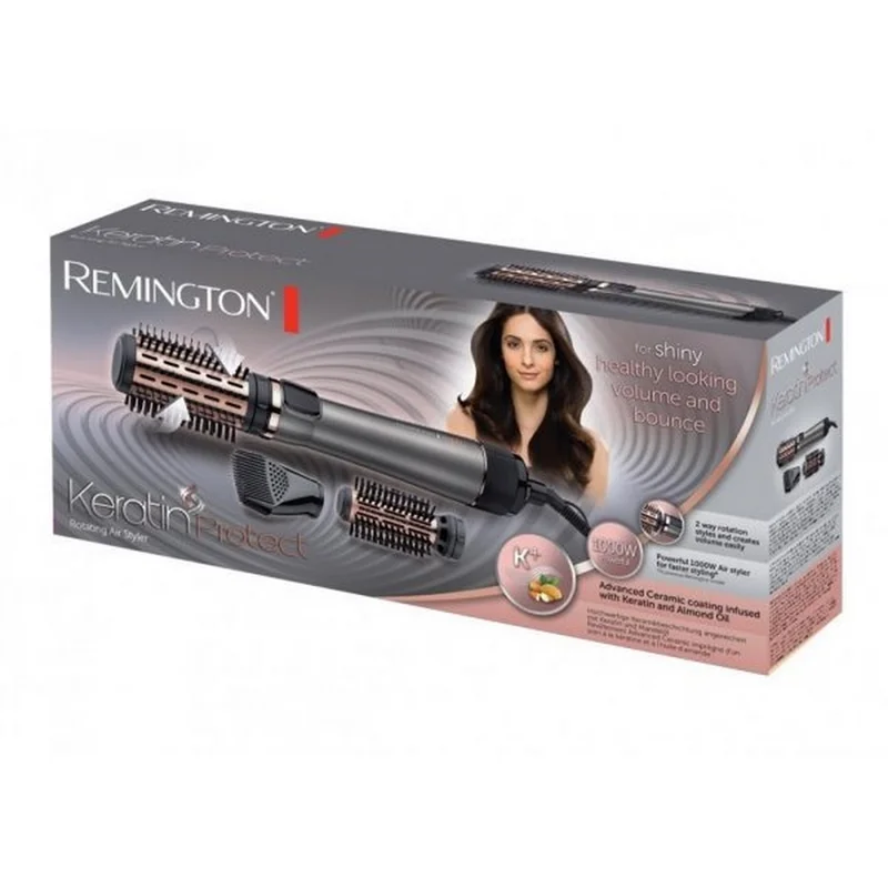 سشوار برس دار چرخشی رمینگتون مدل AS8810 دارای یک موتور فوق العاده قوی بوده که با توان مصرفی 1000 وات علاوه بر خشک کردن سریع موهایتان ،حالت دهنده ای فوق العاده برای هر نوع مویی می باشد. روکش برس های این سشوار چرخشی رمینگتون از جنس سرامیک بوده و با روغن بادام پوشش داده شده است،که مناسب برای موهای کراتین می باشد. سشوار برس دار چرخشی رمینگتون مدل AS8810 دارای سه حالت باد سرد ، باد ملایم ، و باد گرم می باشد که شما میتوانید ، توسط یک حلقه که انتهای دسته قرار داده شده است ، حالت های مختلف را امتحان نمایید. همچنین روی بدنه دستگاه ضامن مخصوصی برای قفل کردن جهت چرخش می باشد.