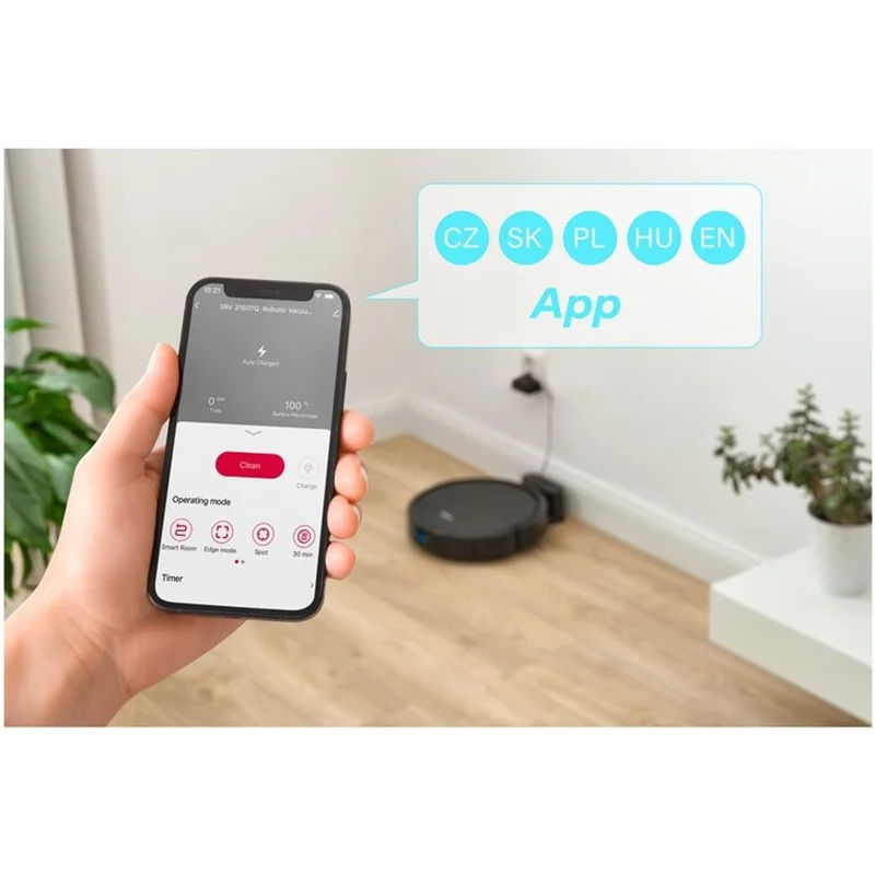 جاروبرقی رباتیک سنکور مدل SRV 3160 TQ مخزن آب و حوله نیز امکان برق انداختن سرامیک را مهیا میکند. باتری آن گنجایش کافی برای کار 100 دقیقهای را فراهم میکند. و در صورت اتمام شارژ نیز به طور خودکار به ایستگاه شارژ برگشته باتری را به طور کامل شارژ میکند. سنسور های تعبیه شده آن نیز دقت و ظرافت کار آن را بسیار بالا میبرند. همچنین با اتصال آن به اپلیکیشن میتوانید از طریق تلفن همراه، عملکرد آن را از دور کنترل نمایید.