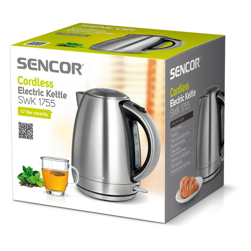 کتری برقی سنکور مدل SWK 1755 با توان 2000 وات قادر به جوشاندن سریع آب برای دم کردن چای، نسکافه و دمنوش می باشد.این کتری دارای ظرفیت 1.7 لیتری، بدنه استیل ضد زنگ و مجهز به توری تفاله گیر است.از کف تمام استیل ساخته شده و مجهز به سنسور خاموشی خودکار می باشد.تا ظرفیت 1.7 لیتر می توانید آب را با این کتری در هر بار بجوشانید. بدنه کتری در یک طرف دسته نشانه گذاری شده،تا همواره از میزان آب باقی مانده داخل آن مطلع شوید.توجه کنید که هیچگاه کتری را بدون آب روشن نکنید و در صورت ریختن آب نیز نباید حجم آن بیشتر از 1.7 لیتر باشد، زیرا در هنگام جوشیدن، آب سر ریز کرده و ممکن است به دستگاه و کاربر آسیب برساند.