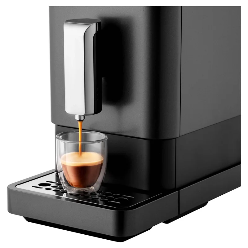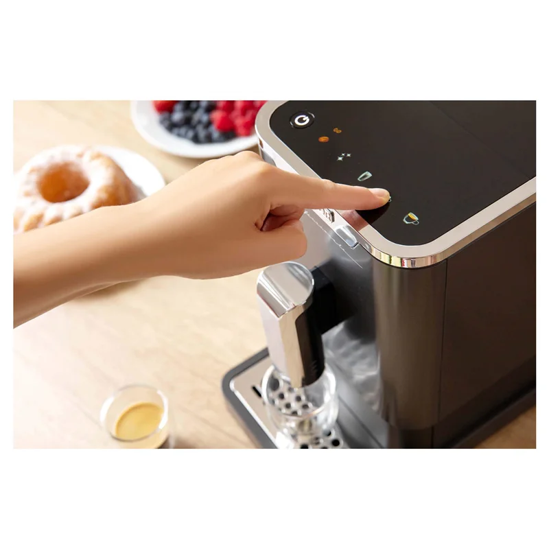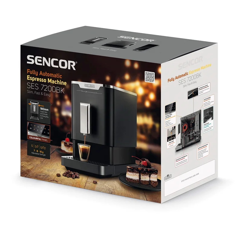 اسپرسوساز سنکور مدل SES 7200BK دستگاهی کاملاً اتوماتیک است. این دستگاه اسپرسوساز با کیفیت شرکت سنکور دارای نمایشگر LED بر روی پنل دستگاه است. با استفاده از این پنل لمسی میتوان آسیاب، نوع نوشیدنی، تک و دوبل، سیستم های هشدار دهنده و… را کنترل و مشاهده کرد.این دستگاه دارای حافظهی قابل تنظیم است که از چه مقدار قهوه برای نوشیدنی استفاده کند. میتوان غلظت قهوه را در 7، 8 و 10 گرم تنظیم کرد. این دستگاه همچنین دارای نازل خروجی نوشیدنی با قابلیت تنظیم ارتفاع و متحرک است. برای استفاده از این دستگاه شما فقط نیاز دارید تا دانههای قهوه یا پودر قهوه را در محفظهی مخصوص بریزید و آسیاب کنید و مخزن آب را پر کنید.