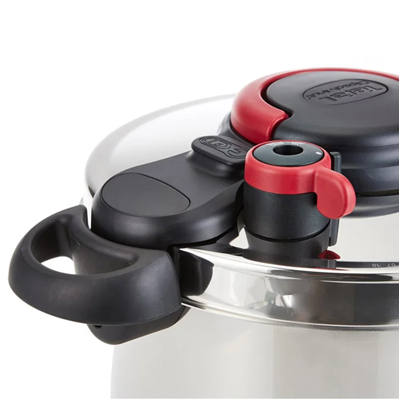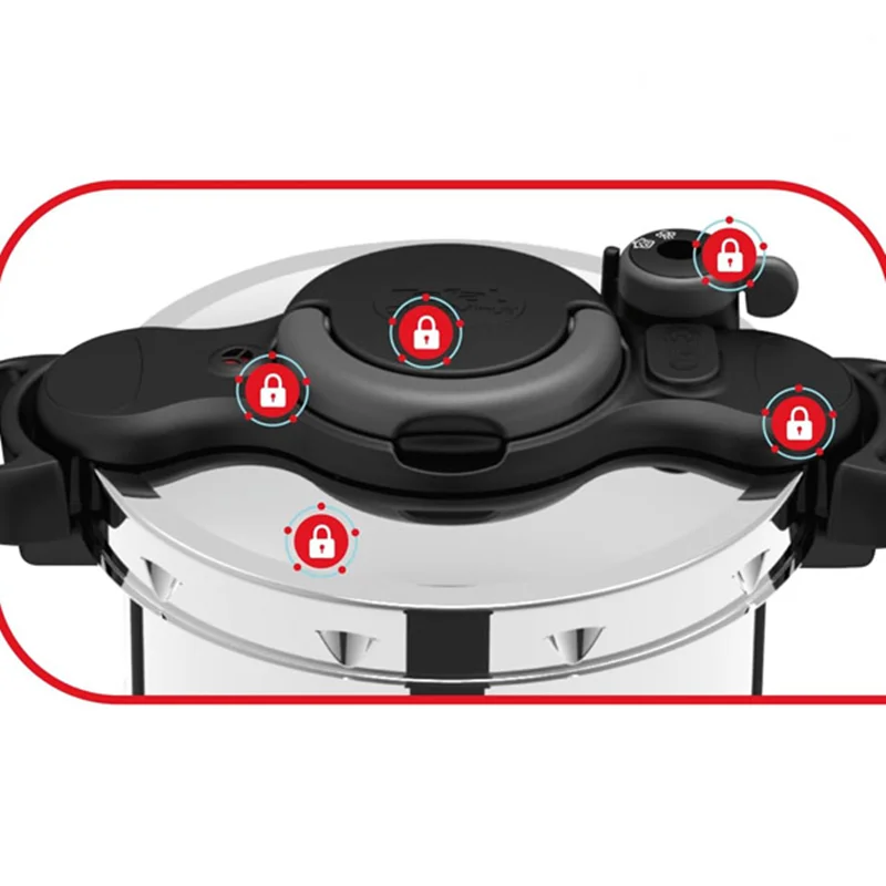 درب این محصول اهرمی است و باز و بست کردن آن با یک دست امکان پذیر می باشد.زودپز تفال مدل Clipso Minut Easy P4624966 دارای 5 سیستم امنیتی است که شما را از نگرانی خارج نشدن بخار و منفجر شدن زودپز راحت می کند.