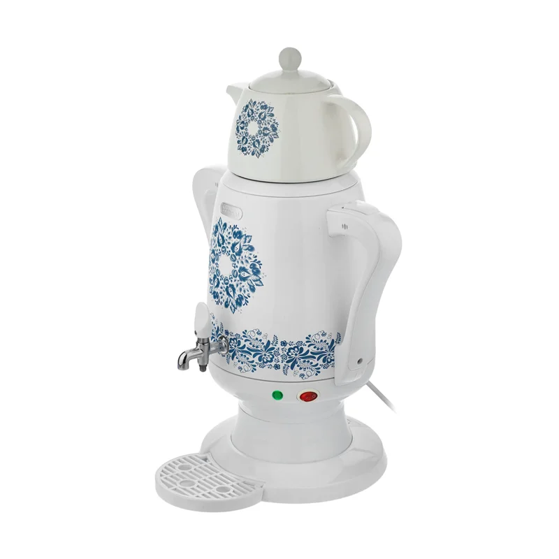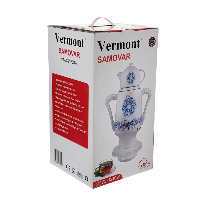 سماور برقی ورمونت مدل VT-ES2123GW محصولی مدرن با طراحی کلاسیک و بسیار زیباست که به کمک آن می توانید آب جوش و چای خوش عطر و طعم دلخواه خود را آماده نموده و تا ساعت ها گرم نگه دارید. بدنه سماور از جنس استیل با روکش پلاستیک می باشد که علاوه بر زیبایی ظاهری، استفاده و کار با دستگاه را آسان نموده است.